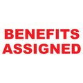 The BENEFITS ASSIGNED self-inking stamp provides a clean, consistent impression for document marking in insurance office environments.
