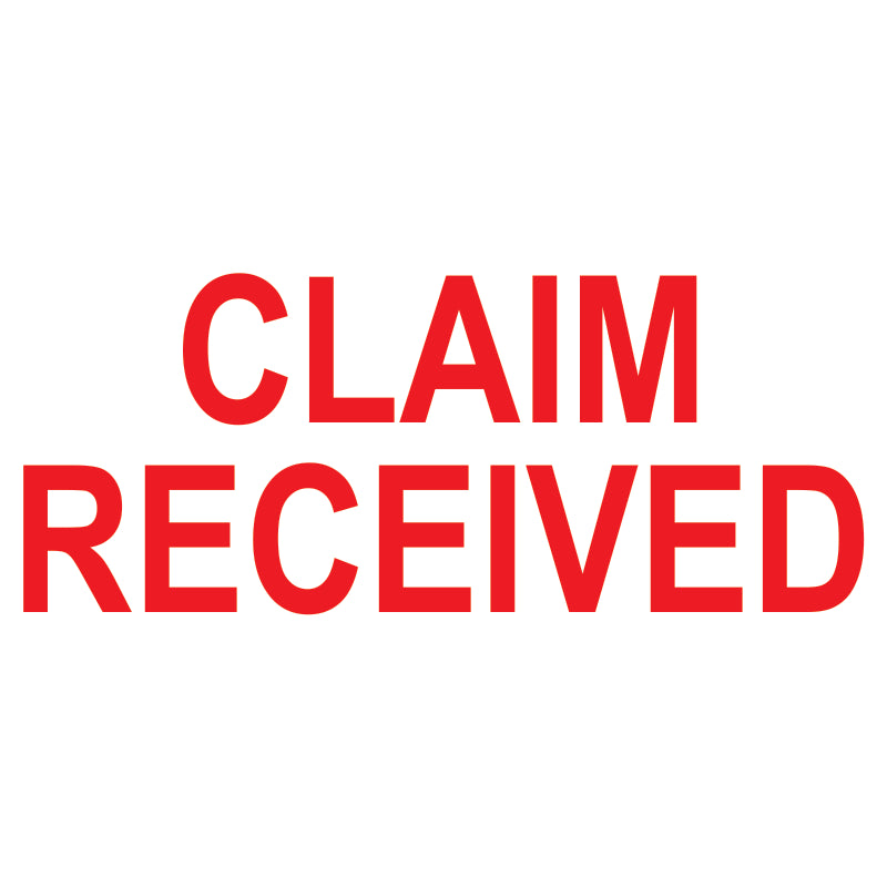 The CLAIM RECEIVED self-inking stamp provides a clean, consistent impression for document marking in insurance office environments.