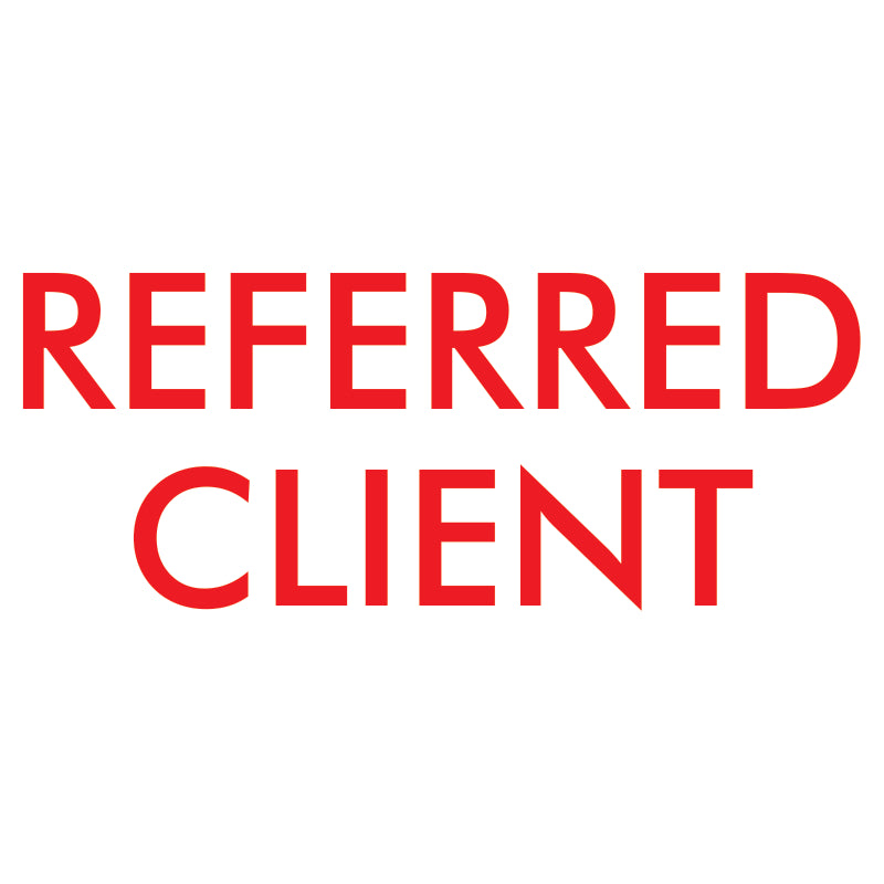 The REFERRED CLIENT self-inking stamp provides a clean, consistent impression for document marking in insurance office environments.