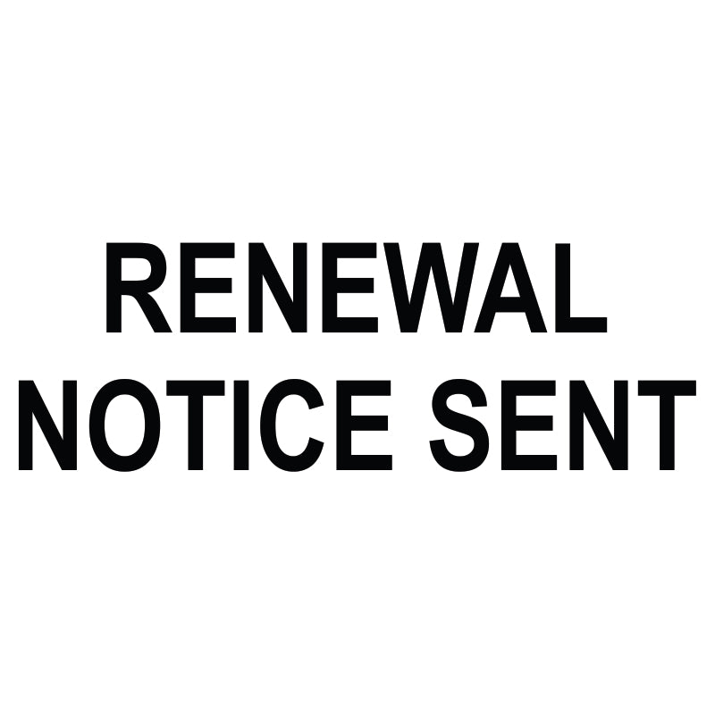 The RENEWAL NOTICE SENT self-inking stamp provides a clean, consistent impression for document marking in insurance office environments.