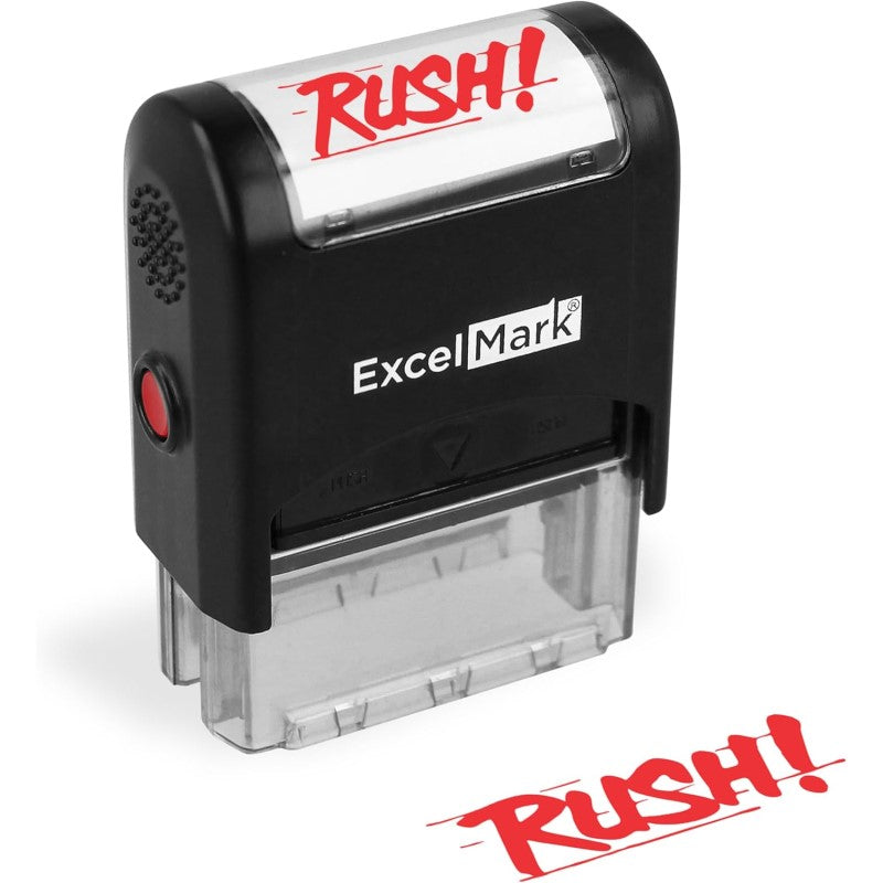 Ensure efficient communication and provide clear labeling with the use of this "RUSH!" office stamp. This ExcelMark A-1539 stamp features a 1/2" by 1-1/2" rectangle impression area. A durable, yet lightweight, plastic construction provides long-lasting use. A self-inking mount re-inks the die before each impression, making it ideal for quick, repetitive stamping. In addition, a unique, reversible (two-sided) ink pad doubles the life of the pad. Simply push it out, flip it over, reinsert and keep stamping! Each side of your ExcelMark ink pad initially lasts for thousands of impressions and is simple to re-ink and replace. Choose from black, red, blue, green, purple or brown ink. A clear base on the mount allows you to always easily line up impressions. Stay organized with this ExcelMark Rush Stamp today!